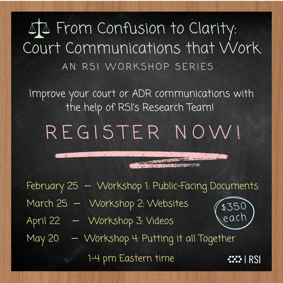RSI is offering a series of online workshops to help courts and organizations enhance their ADR program communication materials. During these workshops — From Confusion to Clarity: Court Communications that Work — RSI’s researchers will work with participants to review and improve their communication materials, including notices, webpages and videos. Participants will walk away with new or updated materials and the strategies to ensure future communications can effectively serve their communities, including self-represented litigants (SRLs).